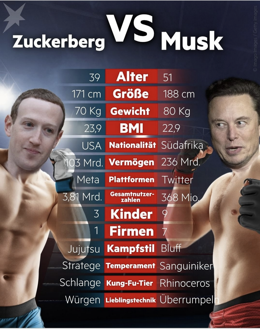 Hin und wieder schreiben wir alten Kung-Fu-Meister auch gern mal ein kleines Tech-Feuilleton. Da wohl schon bald ein Käfig-Kampf zwischen Musk und Zuckerberg ansteht, habe ich für meinen Dojo "stern+" einen Kampfstil-Vergleich der beiden Milliardäre verfasst.