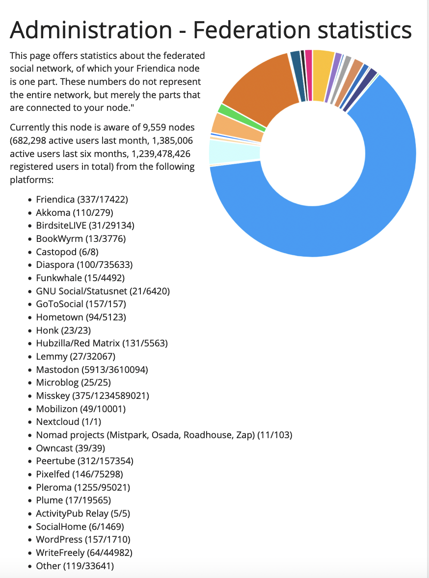 These are the federation statistics of my single-user-instance on #Friendica. I am following 631 people from different platforms. This connects me to 9,559 nodes (682,298 active users last month, 1,385,006 active users last six months, 1,239,478,426 registered users in total). The charts shows on which platforms they are distributed. Pure magic!